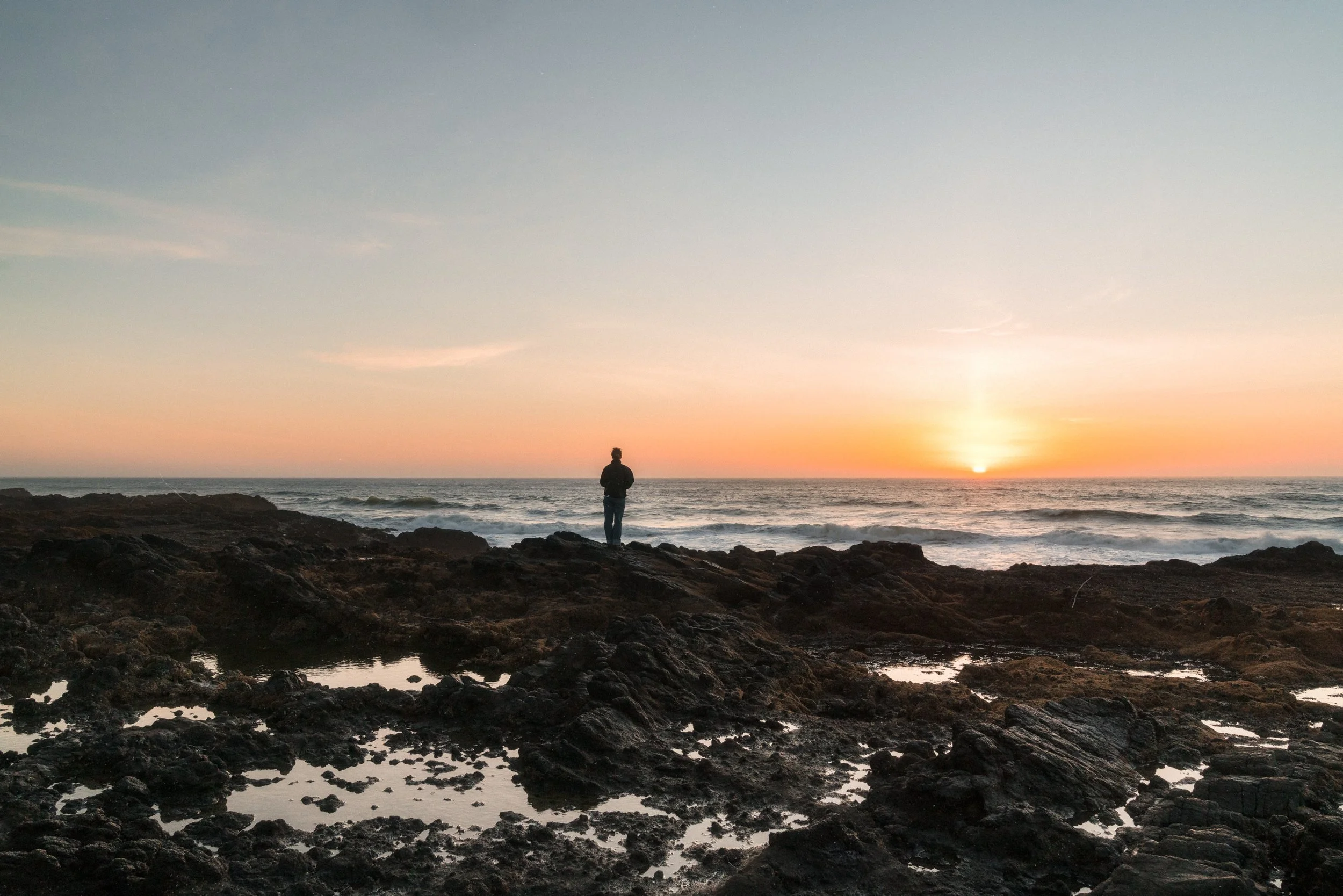 Coastal forest view with evergreen trees framing a sandy beach and ocean waves, a lone person standing on the shore.