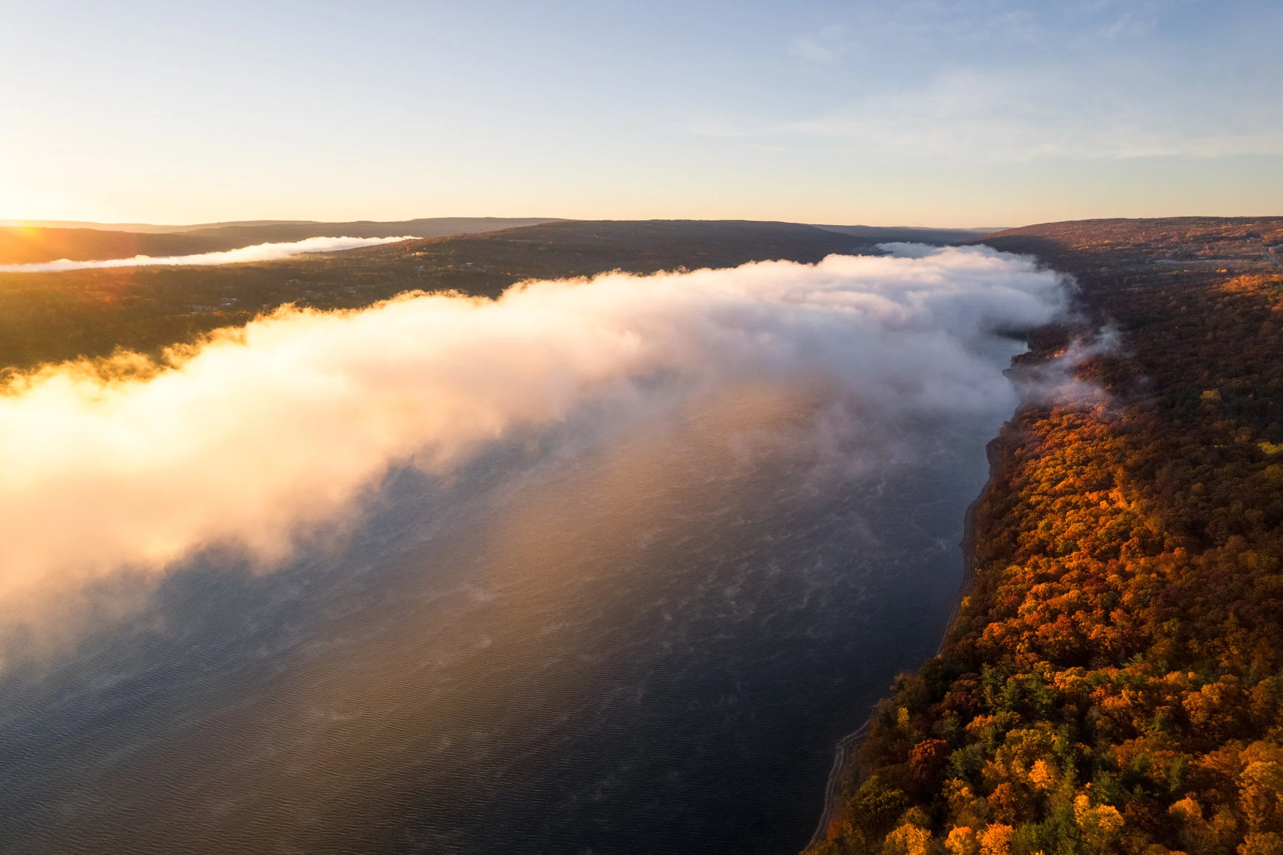 Aerial view of a river with steam rising from hot water, surrounded by autumn-colored trees and fog at sunrise or sunset.