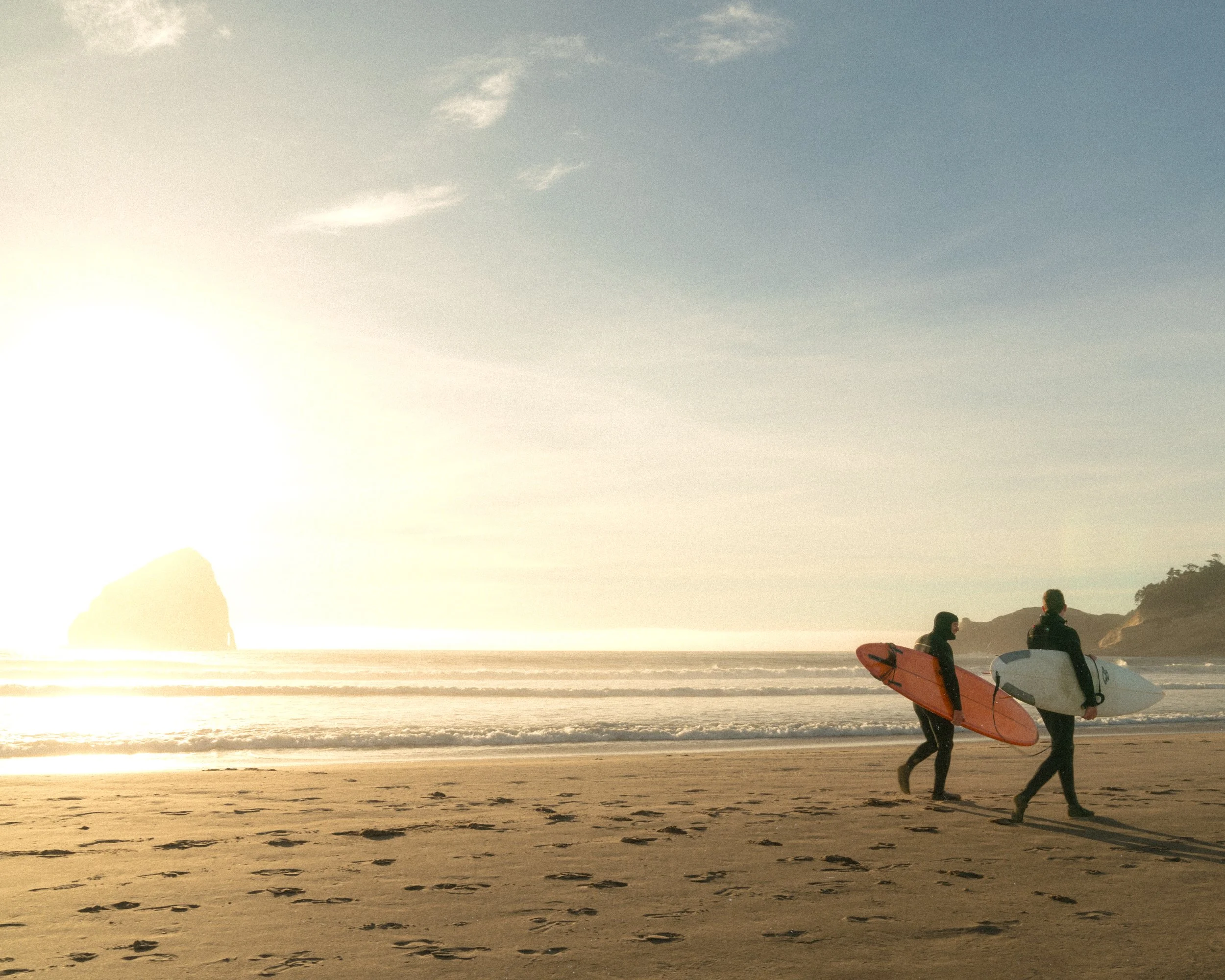 Two surfers carrying surfboards walking on a beach towards the ocean during sunset, with a large rock formation and gentle waves in the background.